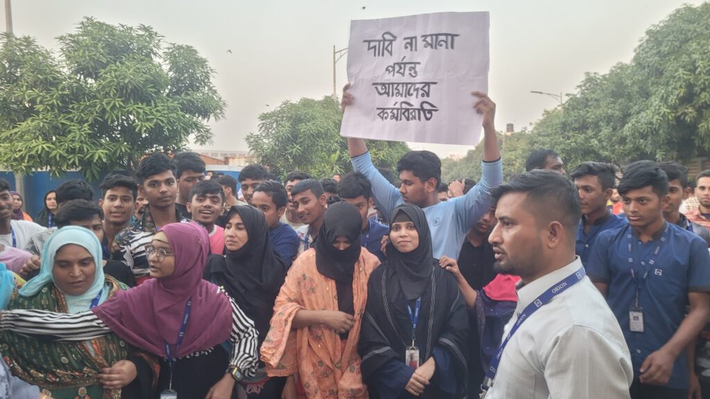 শ্রমিকদের সাথে কথা বলে জানা গেছে, ওরিয়ন কারখানায় শ্রমিকদের বর্তমানে বেতন দিনপ্রতি ৩২৫ টাকা করে পান। যা তাদের জন্যে কম হয়ে যায়। এজন্য তারা বেতন বাড়িয়ে ৫’শ করার দাবি জানিয়ে আসছেন দীর্ঘ ৩ মাস ধরে। তবে কোম্পানির কর্মকর্তারা বেতন বাড়ানোর আশার বাণী শোনালেও সমাধান না করায় আজ আন্দোলনে নামে তারা। শ্রমিকদের দাবি অনুযায়ী কোম্পানি বেতন ৫’শ টাকা না করলেও ৫০ টাকা বাড়িয়ে ৩৭৫ করবে জানান। তবে শ্রমিকরা তাতে সন্তুষ্ট নয়।