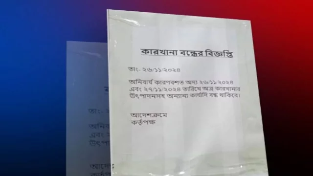 কারখানার ফটকে ঝুলানো এক নোটিশে বলা হয়, কারখানার উৎপাদন মঙ্গলবার ও বুধবার বন্ধ থাকবে।