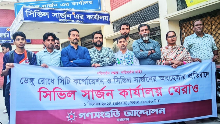নারায়ণগঞ্জে ডেঙ্গু পরিস্থিতি মোকাবেলায় সিটি করপোরেশন ও জেলা স্বাস্থ্য বিভাগের অবহেলার প্রতিবাদে সিভিল সার্জন কার্যালয়ে ঘেরাও করেছে গণসংহতি আন্দোলন নারায়ণগঞ্জ’র নেতৃবৃন্দ। রোববার (১ ডিসেম্বর) শহরের চাষাঢ়া থেকে মিছিল নিয়ে জেলা সিভিল সার্জন কার্যালয় ঘেরাও করে জেলা ও মহানগর গণসংহতি আন্দোলনের নেতাকর্মীরা।