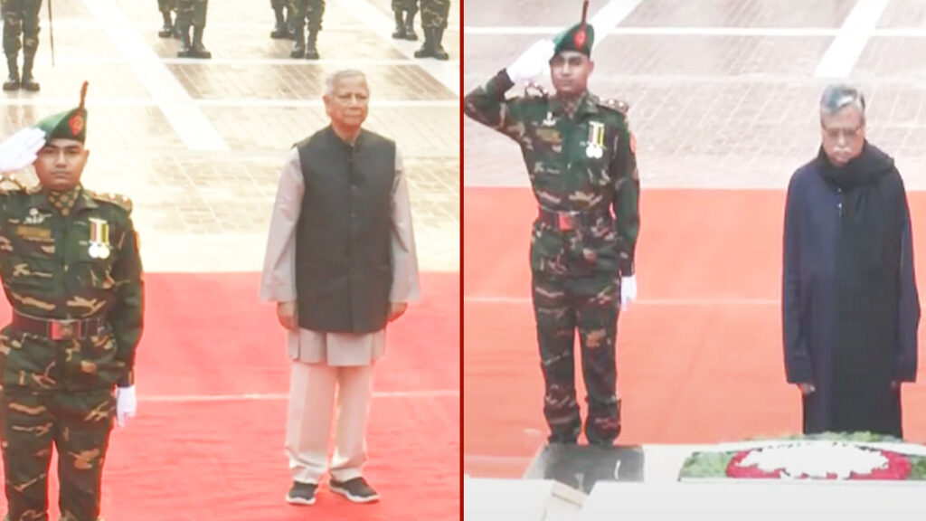 স্মৃতিসৌধে পুষ্পস্তবক অর্পণের পর কিছুক্ষণ নীরবে দাঁড়িয়ে থাকেন রাষ্ট্রপতি ও প্রধান উপদেষ্টা। এ সময় বিউগলে বাজানো হয় করুণ সুর। শহীদদের প্রতি শ্রদ্ধা জানিয়ে গার্ড অব অনার প্রদান করে তিন বাহিনীর একটি চৌকস দল।