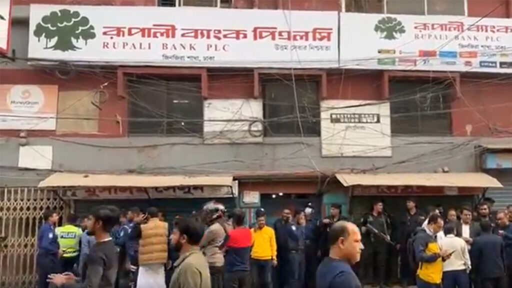 ভবনটির দ্বিতীয় তলায় ব্যাংকে প্রবেশের পরপরই নিচতলায় বিভিন্ন ব্যবসায়ী ডাকাতদের উপস্থিতি টের পায়। তখন ব্যাংকের প্রবেশ ও বের হওয়ার দরজাটি বন্ধ করে দেন। খবর পেয়ে র্যাব–পুলিশ উপস্থিত হয়ে ব্যাংকটি ঘিরে রেখেছে।