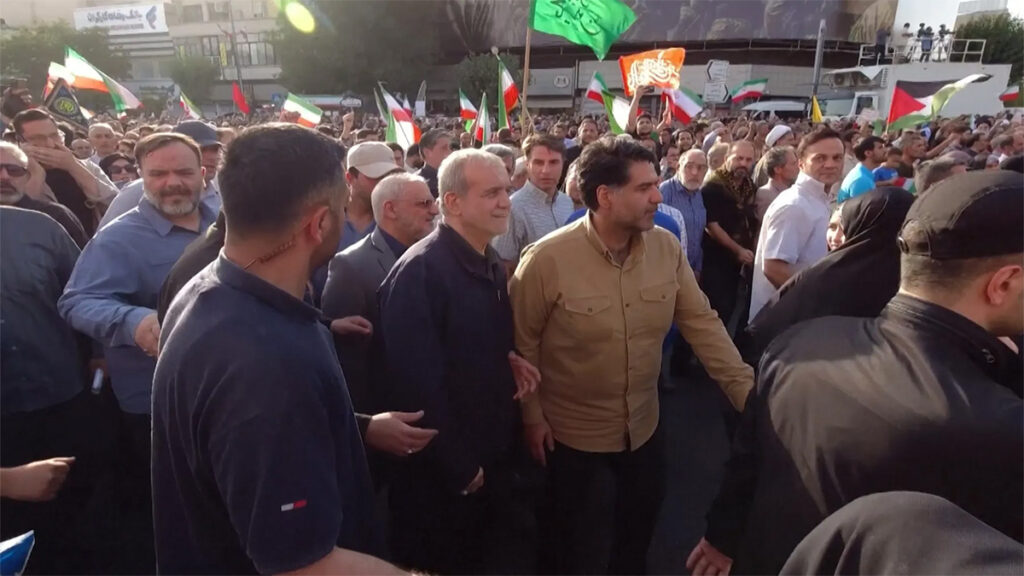 ‘প্রতিশোধ! প্রতিশোধ!’ চিৎকারে মুখরিত হয় তেহরানের রাজপথ। মিছিলের সাথে সমান তালে দোলে বিক্ষোভকারীদের মুষ্টিবদ্ধ হাত। যুক্তরাষ্ট্রের হামলার প্রতিবাদে ইরানের পতাকা হাতে ব্যাপক বিক্ষোভে জড়ো হয় ইরানের সাধারণ মানুষ। এ সময় তাদের সাথে আন্দোলনে যোগ দেন স্বয়ং ইরানের প্রেসিডেন্ট মাসুদ পেজেশকিয়ান।