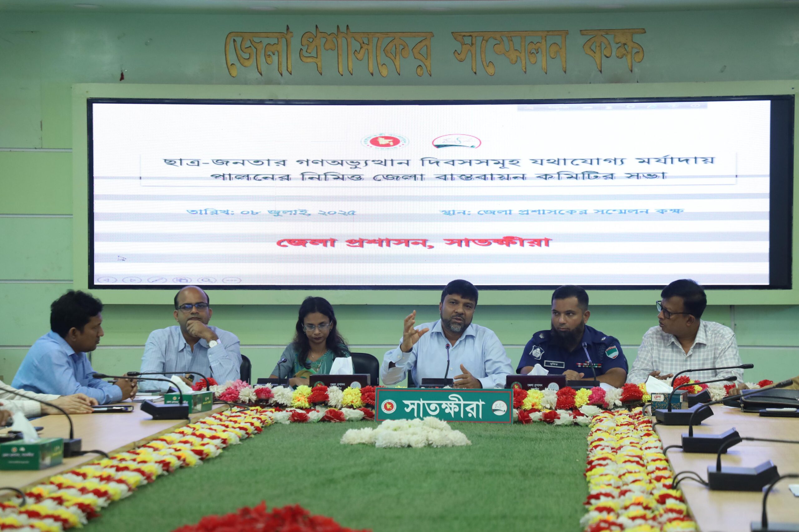 সাতক্ষীরা জেলা প্রশাসনের আয়োজনে মঙ্গলবার (৮ জুলাই) বিকালে জেলা প্রশাসকের সম্মেলন কক্ষে এ সভা অনুষ্ঠিত হয়। জেলা প্রশাসক মোস্তাক আহমেদ এর সভাপতিত্বে সভায় উপস্থিত ছিলেন অতিরিক্ত জেলা প্রশাসক (সার্বিক) বিষ্ণুপদ পাল, এলডিডি মাশরুবা ফেরদৌস, অতিরিক্ত পুলিশ সুপার মুকিত হাসান,সিভিল সার্জন আব্দুস সালাম, জেলা জামায়াতের আমির উপাধ্যক্ষ শহিদুল ইসলাম মুকুল ,জেলা কৃষি কর্মকর্তা কৃষিবিদ সাইফুল ইসলাম, জেলা মহিলা বিষয়ক কর্মকর্তা নাজমুন্নাহার, সদর উপজেলা নির্বাহী কর্মকর্তা শোয়াইব আহমাদ, জেলা তথ্য অফিসার জাহারুল ইসলাম টুটুল, জেলা ক্রীড়া কর্মকর্তা মাহবুবুর রহমানসহ বিভিন্ন শিক্ষা প্রতিষ্ঠানের প্রধান, রাজনৈতিক নেতৃবৃন্দ, ছাত্র প্রতিনিধি ও সরকারি – বেসরকারি প্রতিষ্ঠানে কর্মকর্তাবৃন্দ।