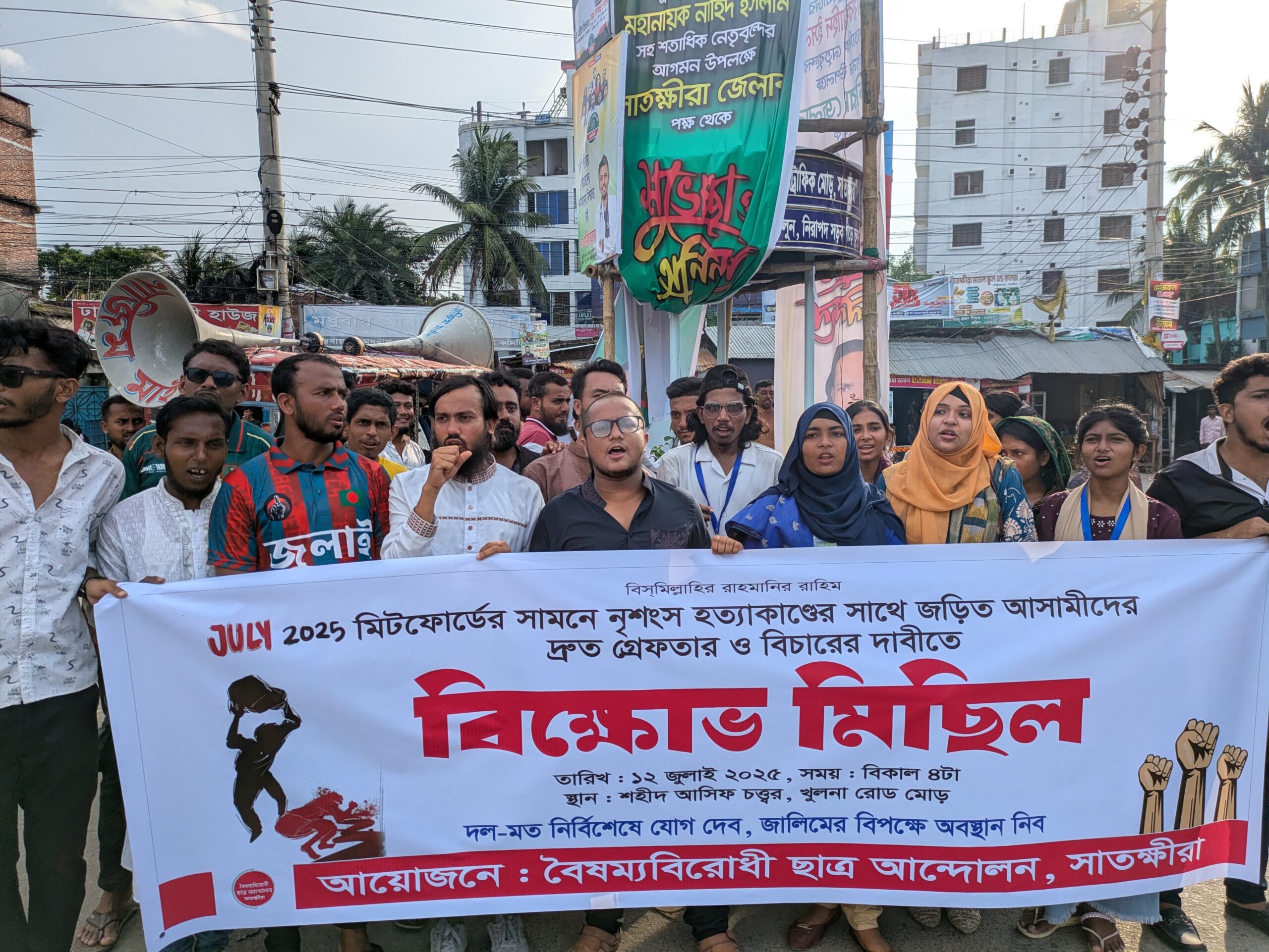 শনিবার (১২ জুলাই) বিকেলে সাতক্ষীরা শহীদ আসিফ চত্বরে এ বিক্ষোভ কর্মসূচি পালন করেন তারা। সেখানে তাঁরা ‘সন্ত্রাসীদের আস্তানা/ জ্বালিয়ে দাও, পুড়িয়ে দাও’, ‘চাঁদাবাজের আস্তানা, জ্বালিয়ে দাও, পুড়িয়ে দাও’, এমন আরও নানা স্লোগান দেন।