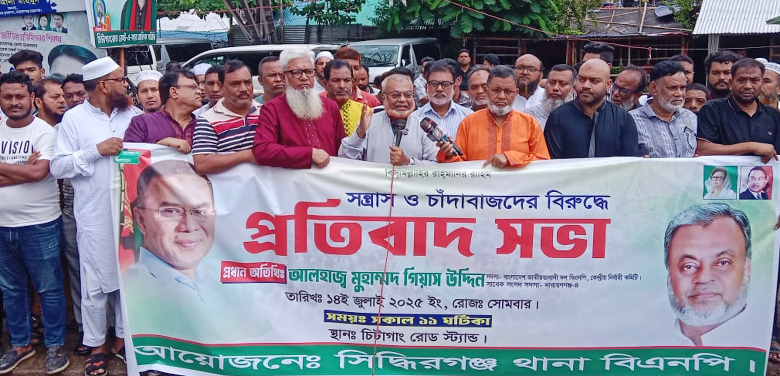 সিদ্ধিরগঞ্জ প্রতিনিধি : দেশজুড়ে অব্যাহত সন্ত্রাস চাদাবাঁজদের নৈরাজ্যের প্রতিবাদে নারায়ণগঞ্জের ঢাকা -চট্রগ্রাম মহাসড়কের শিমরাইল মোড়ে সোমবার বেলা ১১ টায় সিদ্ধিরগঞ্জ থানা বিএনপি আয়োজিত প্রতিবাদ সভায় প্রধান অতিথির বক্তব্যে নারায়ণগঞ্জ ৪ আসনের সাবেক এমপি ও জেলা বিএনপি’র সাবেক সভাপতি মুহাম্মদ গিয়াস উদ্দিন বলেছেন আজ থেকে আমার এলাকা তথা নারায়ণগঞ্জ সিদ্ধিরগঞ্জকে চাদাঁবাজ-সন্ত্রাস মুক্ত ঘোষনা করলাম। এখন থেকে কেউ চাদাঁবাজি সন্ত্রাসী করতে পারবে না এবং কেউ চাদাঁ দিতে পারবে না। এখানে চাদাঁবাজি সহ বিভিন্ন অপরাধ কর্মকাণ্ড শুরু করে গেছেন আওয়ামী দোসর সাত খুনের ফাসির আসামী নুর হোসেন পরিবার এখনো সে জেল খানায় বসে টেলিফোনের মাধ্যমে বিভিন্ন অরাজকতা করছে। তিনি এ বিষয়ে জেল কর্তৃপক্ষে সর্তক করে বলেন জেল খানায় বসে যদি নুর হোসেন কোন অরাজকতা পরিস্থিতি সৃষ্টি করে এর দায়ভার আপনাদের নিতে হবে। চাদাঁবাজ সন্ত্রাসীদের হুশিয়ার করে বলেন কেউ চাদাঁবাজি করলে তার হাত পা ভেঙ্গে দিবেন। ব্যাবসায়ীদের উদ্দেশ্যে তিনি বলেন কাউকে চাদাঁ দিবেন না যদি কেউ চাদাঁ দাবি করে তাদের শক্ত হাতে প্রতিরোধ করবেন আর যদি আপনারা না পারেন তাহলে সরাসরি আমাকে জানাবেন আমরা এদের বিরুদ্ধে ব্যাবস্থা নিবো।