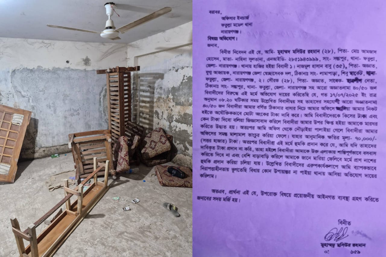 এসময় অভিযোগে উল্লেখ করা হয়, গত ১৭ জুলাই রাত্র অনুমান ০৮.২০ ঘটিকার সময় জেলা স্বেচ্ছাসেবক দলের যুগ্ম আহবায়ক নাজমুল হাসান বাবু, সাবেক ছাত্রলীগ নেতা সৌরভ সহ তাহাদের সহযোগী আরো অজ্ঞাতনামা ৪০/৫০ জন বিবাদীরা আমার বর্ণিত ঠিকানার বাসার নিচে আমার অফিসে আসিয়া আমার নিকট হইতে অযৌক্তিকভাবে মোটা অংকের টাকা দাবি করে। আমি বিবাদীদেরকে কিসের টাকা এবং কেন টাকা দিবো বলিয়া জিজ্ঞাসাবাদ করিলে বিবাদীরা আমার উপর ক্ষিপ্ত হইয়া আমাকে মারধর করিতে উদ্ব্যত হয়। অতঃপর আমি অফিস থেকে দৌড়াইয়া পালাইয়া গেলে বিবাদীরা আমার অফিসের সমস্ত মালামাল ভাংচুর করিয়া ফেলে। যাহার আনুমানিক ক্ষতির মূল্য- ৭০,০০০/-(সত্তর হাজার) টাকা। অতঃপর বিবাদীরা এই মর্মে হুমকি প্রদান করে যে, আমি যদি তাহাদের দাবিকৃত টাকা প্রদান না করি, তাহা হইলে বিবাদীরা আমাকে উক্ত এলাকায় শান্তিপূর্ণভাবে বসবাস করিতে দিবে না এবং বেশি বাড়াবাড়ি করিলে আমাকে জানে মারিয়া ফেলিবে মর্মে প্রাণ নাশের হুমকি প্রদান করে চলে যায়। উল্লেখিত বিবাদীদের এরুপকার্যকলাপে আমি ব্যাপকভাবে নিরাপত্তাহীনতায় ভূগতেছি বিধায় কোন উপায়ান্তর না পাইয়া থানায় আসিয়া অভিযোগ দায়ের করিলাম।