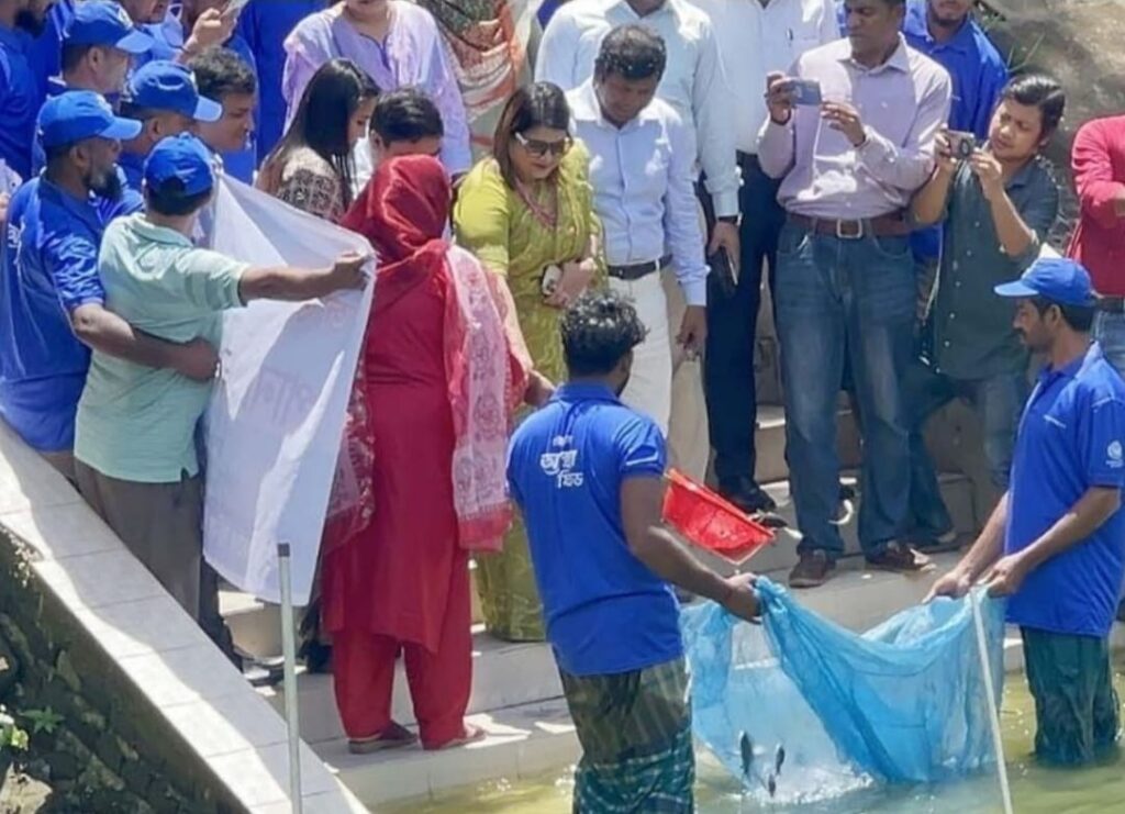 সোনারগাঁ(প্রতিনিধি); নারায়ণগঞ্জের সোনারগাঁয়ে জাতীয় মৎস্য সপ্তাহ উদযাপিত হয়েছে। ‘অভয়াশ্রম গড়ে তুলি,দেশি মাছে দেশ ভরি’-এ প্রতিপাদ্যকে সামনে রেখে গতকাল সোমবার সকালে সোনারগাঁ উপজেলা পরিষদ চত্বরে মৎস্য সপ্তাহের উদ্বোধন করেন সোনারগাঁ উপজেলা নির্বাহী কর্মকর্তা ফারজানা রহমান। এ উপলক্ষে উপজেলা পরিষদ মিলনায়তনে আলোচনা সভা,সফল মৎস্য উদ্যোক্তাদের পুরস্কার প্রদান, মাছের পোনা অবমুক্ত ও র্যালী বের করা হয়। সোনারগাঁ উপজেলা সিনিয়র মৎস্য দপ্তরের আয়োজনে অনুষ্ঠানে প্রধান অতিথি হিসেবে উপস্থিত ছিলেন সোনারগাঁ উপজেলা নির্বাহী কর্মকর্তা ফারজানা রহমান।সোনারগাঁ উপজেলা মৎস্য কর্মকর্তা মাহমুদা আক্তারের সভাপতিত্বে আলোচনা সভায় অন্যদের মধ্যে বক্তব্য রাখেন উপজেলা স্বাস্থ্য ও পরিবার পরিকল্পনা কর্মকর্তা ডা: শারমিন আহমেদ তিথি, কৃষি কর্মকর্তা আবু সাঈদ তারেক, উপজেলা প্রকৌশলী মো: আলমগীর চৌধুরী প্রমুখ। অনুষ্ঠানে উপজেলা বিভিন্ন দপ্ততের অন্যান্য কর্মকর্তা ও মৎস উদ্যোক্তারা উপস্থিত ছিলেন। আলোচনা শেষে উপজেলার সফল মৎস উদ্যোক্তাদের পুরস্কার প্রদান করা হয়। পরে র্যালি বের করা হয় এবং উপজেলা পরিষদের পুকুরে বিভিন্ন জাতের মাছের পোনা অবমুক্ত করা হয়। র্যালিটি উপজেলা চত্বরে বিভিন্ন সড়ক প্রদক্ষিণ করে।