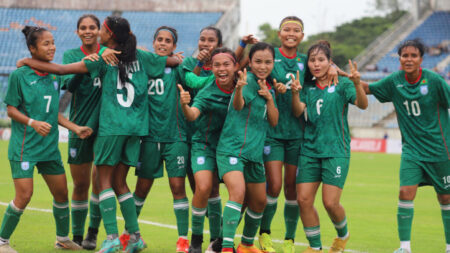 সুরভী আকন্দ প্রীতির হ্যাটট্রিকে নেপালকে আবারও হারিয়েছে বাংলাদেশ। সাফ উইমেন’স অনূর্ধ্ব-১৭ চ্যাম্পিয়নশিপে নেপালকে ৪-১ গোলের ব্যবধানে হারায় লাল সবুজের দল। দলের জয়ে তিন গোল করেন সুরভী আকন্দ প্রীতি। থৈনু মারমা করেন একটি গোল।