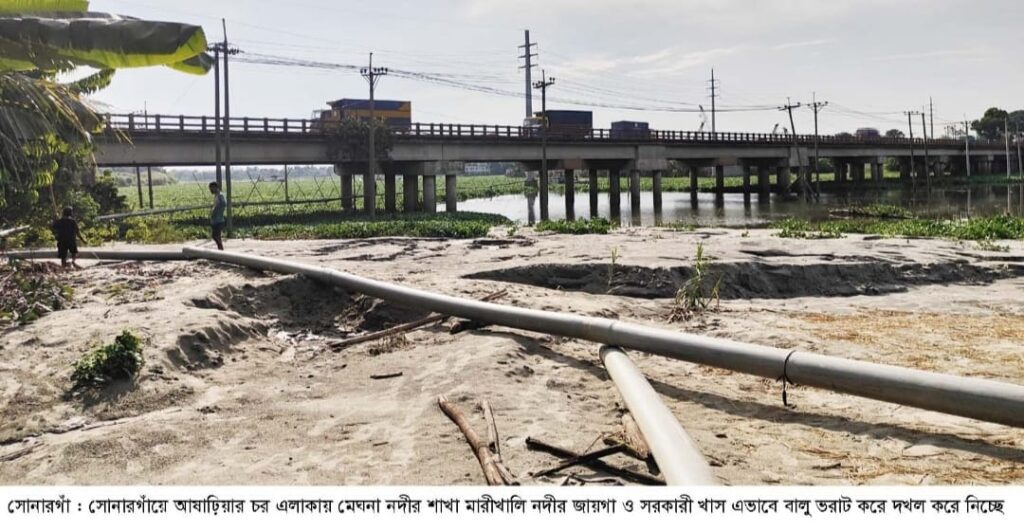 সোনারগাঁ(প্রতিনিধি): নারায়ণগঞ্জের সোনারগাঁয়ে আষাঢ়িয়ার চর এলাকায় মেঘনা নদীর শাখা মারীখালি নদীর জায়গা ও সরকারী খাস জমিতে একটি কোম্পানির পক্ষে বালু ভরাট করার অভিযোগ উঠেছে বিএনপি নেতা দুই ভাইয়ের বিরুদ্ধে। রাতের আধারে ড্রেজারের মাধ্যমে বালু ফেলে এ জমিগুলো দখল করেছে। সোনারগাঁ উপজেলা বিএনপির যুগ্ম সম্পাদক আব্দুর রব ও পিরোজপুর ইউনিয়ন বিএনপির সাংগঠনিক সম্পাদক আব্দুল জলিলের বিরুদ্ধে এ অভিযোগ উঠে। এ ঘটনায় এলাকায় ক্ষোভের সৃষ্টি হয়েছে। তবে বিএনপি নেতা দাবি তার ও কোম্পানির ক্রয়কৃত জমিতে বালু ভরাট করেছেন। সেখানে কোন নদীয় জায়গা নেই।জানা যায়, উপজেলার পিরোজপুর ইউনিয়নের আষাঢ়িয়ার চর ব্রীজ এলাকায় মেঘনা নদীর শাখা মারীখালি নদীর জায়গা ও সরকারী খাস জমি দখল করে একটি কোম্পানিকে বালু ভরাট করে দেন সোনারগাঁ উপজেলা বিএনপির যুগ্ম সম্পাদক আব্দুর রব ও পিরোজপুর ইউনিয়ন বিএনপির সাংগঠনিক সম্পাদক আব্দুল জলিল। ওই কোম্পানি পক্ষে মোটা অংকের টাকার বিনিময়ে প্রায় ২০কোটি টাকা মূল্যের জমি বালু ভরাট করেন। ফলে এ নদীতে বিভিন্ন নৌযান চলাচল বন্ধ হয়ে যাওয়ার উপক্রম হয়ে পড়ছে।এলাকাবাসীর দাবি, দীর্ঘদিন ধরে এ এলাকার কয়েক হাজার মানুষ এ নদীতে গোসল করা থেকে শুরু করে রান্নাবান্নার পানি নেওয়ার জন্য এ স্থান ব্যবহার করতো। বর্তমানের বালু ভরাট করে ফেলার কারনে তা আর সম্ভব হবে না। মানুষের মাছ ধরার জীবিকাও নষ্ট করে ফেলা হয়েছে। নদীর জমির পাশাপাশি ব্যক্তিমালিকানা জায়গাও দখল নিয়েছেন।স্থানীয়রা জানায়, আওয়ামী লীগ সরকার পতনের পর বিএনপির নাম ভাঙ্গিয়ে তারা দুই ভাই ওই এলাকায় দখলের রাজত্ব কায়েম করেছেন। সড়ক জনপথের জায়গা দখল করে দোকান পাট নির্মাণ, কোম্পানির ট্রাক আটকে চাঁদাবাজি, অবৈধ গ্যাস ব্যবহার করে চুনা কারখানা নির্মাণ, জমি দখল, আওয়ামীলীগ নেতাকর্মীদের বাড়িঘরে হামলা করে লুটপাট থেকে শুরু করে সকল অপকর্ম করে বেড়াচ্ছেন। সোনারগাঁ উপজেলা বিএনপির এক প্রভাবশালী নেতার ছত্রছায়ায় থাকার কারনে তাদের বিরুদ্ধে কোন ব্যবস্থা নেওয়া হচ্ছে না।নাম প্রকাশ না করার শর্তে পিরোজপুর ইউনিয়ন বিএনপির প্রথম সারির এক নেতা জানান, ৫আগষ্ট শেখ হাসিনার পতনের পর বিভিন্ন কোম্পানিতে গিয়ে আব্দুর রব ও তার ভাই আব্দুল জলিল তাদের নেতাকর্মীদের নিয়ে উৎপাত ও লোকজন মারধর শুরু করেন এক সময় কোম্পানির বিরোধীতা করলেও এখন তারা ওই কোম্পানির পক্ষেই অবস্থান নিয়ে নদীর জায়গায় বালু ভরাটের মাধ্যমে দখল করে দেয়।সরেজমিনে গিয়ে দেখা যায়, আষাঢ়িয়ার চর ব্রীজের পূর্ব পাশে বিস্তৃণ এলাকা জুড়ে শাখা নদীতে বালু ভরাট করে রাখা হয়েছে। মারীখালির নদীর মধ্যভাগে বাশের খুটি ও বেড়া দিয়ে বালু ভরাট করে। সেখ