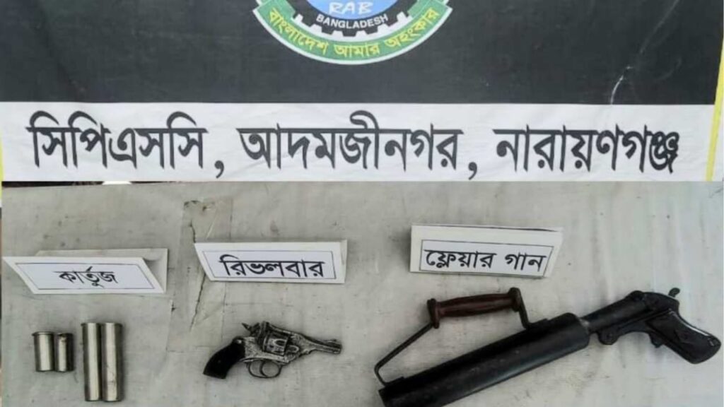বুধবার (১৭ সেপ্টেম্বর) দুপুরে সিদ্ধিরগঞ্জের আদমজীনগরে র্যাব-১১ ব্যাটালিয়ন সদর দফতরের কোম্পানি কমান্ডার লে. কমান্ডার মো. নাঈম উল হক স্বাক্ষরিত এক সংবাদ বিজ্ঞপ্তিতে এ তথ্য জানানো হয়।র্যাব জানায়, দীর্ঘদিন ধরে দায়িত্বপূর্ণ এলাকায় দুর্ধর্ষ সন্ত্রাসী ও অবৈধ অস্ত্রধারীদের বিরুদ্ধে গোয়েন্দা নজরদারি চালানো হচ্ছিল। এরই ধারাবাহিকতায় মঙ্গলবার রাত আড়াইটায় বিশেষ অভিযানে একটি বিদেশি রিভলভার, একটি বিদেশি ফ্লেয়ার গান, দুই রাউন্ড তাজা গুলি ও দুই রাউন্ড কার্তুজসহ খোরশেদ, রিপন ও জয়কে গ্রেফতার করা হয়।প্রাথমিক জিজ্ঞাসাবাদে তারা স্বীকার করেছে, সিদ্ধিরগঞ্জসহ নারায়ণগঞ্জের বিভিন্ন এলাকায় অবৈধ বিদেশি আগ্নেয়াস্ত্র প্রদর্শন ও ব্যবহার করে সাধারণ মানুষকে ভয়-ভীতি দেখিয়ে সন্ত্রাসী কার্যক্রম চালিয়ে আসছিল। তাদের কাছ থেকে উদ্ধার হওয়া অস্ত্র ও গুলির কোনো বৈধ কাগজপত্র নেই এবং এগুলো অবৈধ বলেও তারা স্বীকার করেছে।