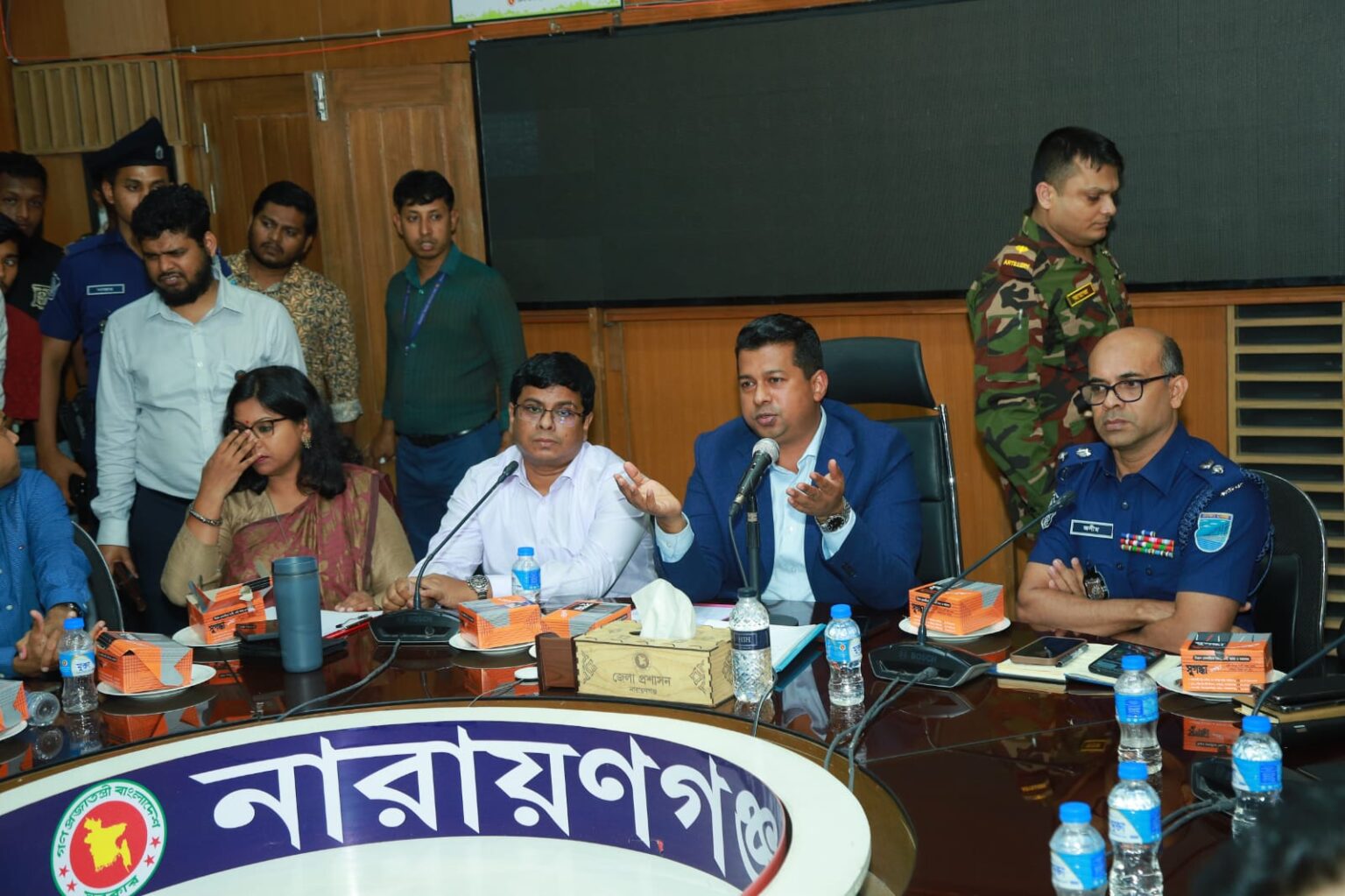 এসময় আরও উপস্থিত ছিলেন অতিরিক্ত জেলা ম্যাজিস্ট্রেট নিলুফা ইয়াসমিন, অতিরিক্ত জেলা প্রশাসন (সার্বিক) আলমগীর হোসাইন, অতিরিক্ত পুলিশ সুপার (ক্রাইম এন্ড অপারেশন) তারেক আল মেহেদী, নারায়ণগঞ্জ মহানগর বিএনপির আহবায়ক এড.সাখাওয়াত হোসেন খান, সদস্য সচিব এড. আবু আল ইউসুফ খান টিপু, জামায়তে ইসলামী মহানগরীর সাবেক আমীর মাওলানা মাঈনুদ্দিন আহমাদ, ইসলামী আন্দোলন মহানগরের সভাপতি মুফতি মাসুম বিল্লাহ, বিকেএমইএ পরিচালক আহমেদুর রহমান তনু, ইজিবাইক মালিক সমিতির সভাপতি রহমান প্রমুখ।