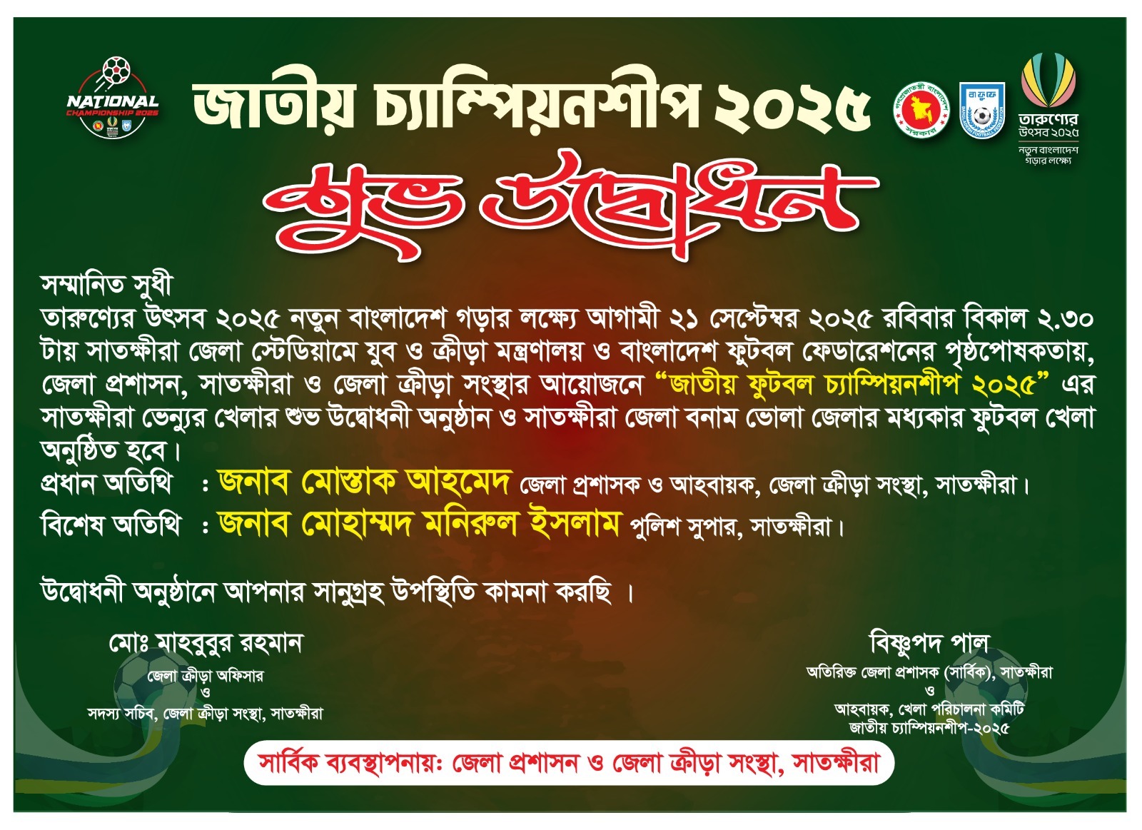 “তারুণ্যের উৎসব ২০২৫, নতুন বাংলাদেশ গড়ার লক্ষ্য” এই স্লোগানকে সামনে রেখে সাতক্ষীরায় শুরু হতে যাচ্ছে জাতীয় ফুটবল চ্যাম্পিয়নশিপ ২০২৫। আগামী রবিবার (২১ সেপ্টেম্বর ২০২৫) বিকাল সাড়ে ২টায় সাতক্ষীরা জেলা স্টেডিয়ামে এই প্রতিযোগিতার উদ্বোধনী অনুষ্ঠান অনুষ্ঠিত হবে।
