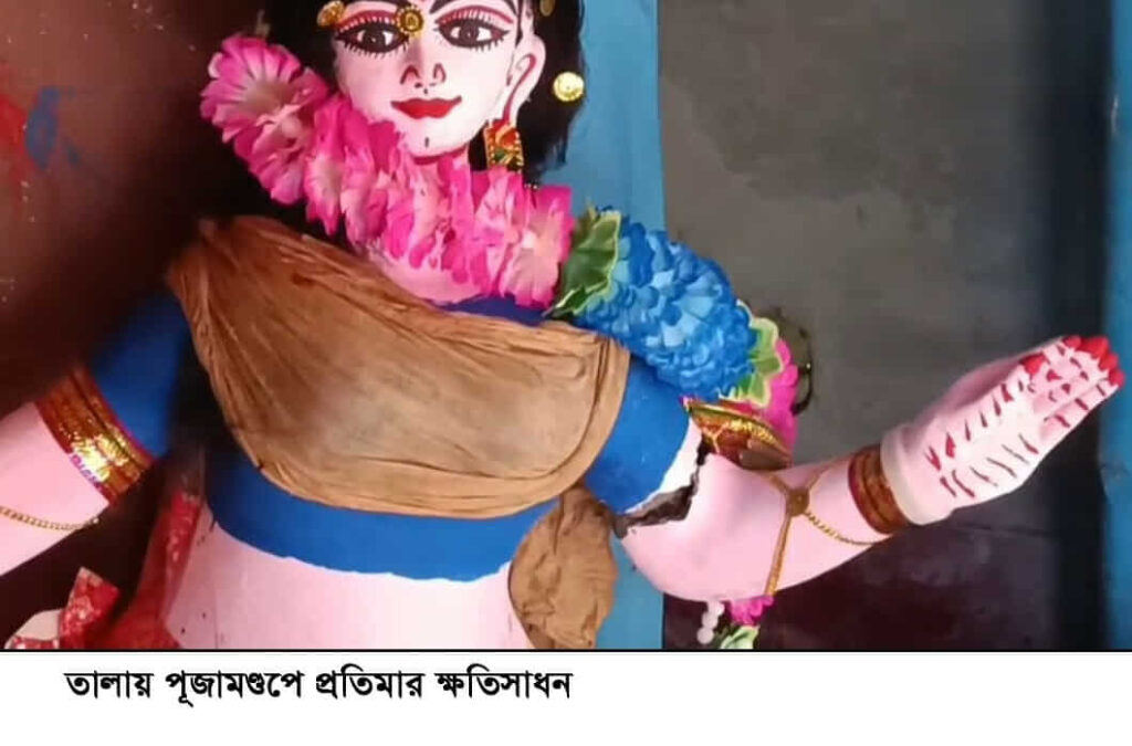 সাতক্ষীরার তালা উপজেলার তেঁতুলিয়া ইউনিয়নের কলাপোতা পূর্বপাড়া বটলতা পূজামণ্ডপে প্রতিমার পোশাক নষ্ট ও ক্ষত করার ঘটনা ঘটেছে। সোমবার (২২ সেপ্টেম্বর) গভীর রাতে এ ঘটনা ঘটে। মঙ্গলবার (২৩ সেপ্টেম্বর) সকালে উপজেলা প্রশাসন ও পূজা উদযাপন কমিটির নেতৃবৃন্দ ঘটনাস্থল পরিদর্শন করেন। পূজামণ্ডপের উপদেষ্টা বলাই দাস জানান, সকালে স্কুলে যাওয়ার পথে একটি ছেলে মণ্ডপে গিয়ে দেখতে পায় প্রতিমার বেশ কিছু জায়গায় ক্ষতের চিহ্ন রয়েছে এবং পোশাক খুলে ফেলার চেষ্টা করা হয়েছে। পরে সে বিষয়টি সবাইকে জানায়। পূজামণ্ডপের সভাপতি বলয় দাস বলেন, বৃষ্টির কারণে সিসি ক্যামেরা বন্ধ ছিল। কোনো প্রহরীও ছিল না। ধারণা করা হচ্ছে, প্রতিমার গায়ে স্বর্ণালংকার রয়েছে এমন গুজব শুনে দুর্বৃত্তরা প্রবেশ করে। পরে আসল স্বর্ণালংকার নেই বুঝতে পেরে প্রতিমার ক্ষতিসাধন করে চলে যায়। তালা উপজেলা পূজা উদযাপন কমিটির সভাপতি মৃণাল কান্তি রায় বলেন, এটি কোনো সাম্প্রদায়িক ঘটনা নয়। কেবল দুর্বৃত্তরা এমন ন্যাক্কারজনক কাজ করেছে। তালা থানার অফিসার ইনচার্জ (ওসি) মো. মাইনউদ্দিন বলেন, ঘটনাস্থল পরিদর্শন করা হয়েছে। এটি দুর্বৃত্তদের কাজ বলে প্রাথমিকভাবে ধারণা করা হচ্ছে। তালা উপজেলা নির্বাহী কর্মকর্তা (ইউএনও) দীপা রাণী সরকার ঘটনাস্থল ঘুরে দেখেন এবং পূজামণ্ডপের সুরক্ষার বিষয়ে প্রয়োজনীয় পদক্ষেপ নেয়ার আশ্বাস দেন।