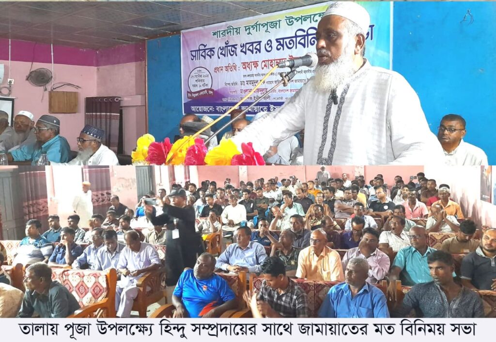 সাতক্ষীরার তালায় দূর্গা পূজার সার্বিক খোজ খবর ও হিন্দু সম্প্রদায়ের সাথে জামায়াতের মত বিনিময় সভায় সাতক্ষীরা -১, তালা-কলারোয়া আসনের সংসদ সদস্য পদপ্রাথী জামায়াতের কেন্দ্রীয় কর্মপরিষদ জনাব অধ্যক্ষ ইজ্জত উল্লাহ একথা বলেন। তিনি আরও বলেন মুসলিমদের ধর্মীয় অনুষ্ঠানে কোনো পাহারা দেওয়ার প্রয়োজন হয়না তাহলে হিন্দু সম্প্রদায়ের পূজা মন্ডবে কেনো পাহারা দিতে হবে। বাংরাদেশ জামায়াতে ইসলামী এমন একটি সমাজ বিনির্মাণ করতে চায় যেখানে সকল ধর্মের লোকজন সমানভাবে রাষ্ট্রীয় সুবিধা ভোগ করবে। এবং শতভাগ সামপ্রদায়িক সম্প্রীতি বাজায় থাকবে, ইতি মধ্যে হিন্দু সম্প্রদায়ের বিভিন্ন সময়ে তাদের পাশে দাড়িয়ে জামায়াত তার প্রমাণ রেখেছে। তালা উপজেলা জামায়াতের সেক্রেটারী ইদ্রিস আলীর সঞ্চালনায় ২৭ সেপ্টেম্বর শনিবার সকাল ১০ টায় বাংলাদেশ জামায়াতে ইসলামী তালা উপজেলা শাখা কর্তৃক আয়োজিত অনুষ্ঠানে আরও উপস্থিত ছিলেন উপস্থিত ছিলেন বাংলাদেশ জামায়াতে ইসলামীর জেলা নায়েবে আমীর ডাঃ মাহমুদুল হক, শ্রমিক কল্যাণ ফেডারেশনের জেলা সভাপতি গাজী সুজায়েত আলী , তালা উপজেলা জামায়াতের আমীর মাওঃ মফিদুল্লাহ, ডাঃ আফতাব উদ্দীন, প্রফেসর আয়ুব আলী, শ্যমিক কল্যাণ ফেডারেশন তালা উপজেলার সভাপতি মাষ্টার আমিনুর রহমান, ইসলামকাটি ইউনিয়ন চেয়ারম্যান গোলাম ফারুক, মাগুরার ইউপির সাবেক চেয়ারম্যান আয়ুব আলী, সাতক্ষীরা প্রেস ক্লাবের সাবেক সভাপতি, আলতাপ হোসেন, ও সাবেক সভাপতি রামকৃষ্ণ চক্রবর্তী, তালা উপজেলা পূজা উদযাপন কমিটির সাধারণ সম্পাদক নারায়ন চন্দ্র মজুমদার, শালিখা কলেজের অধ্যক্ষ বিধান চন্দ্র সাধু, অজিৎ ঘোষ, বীর মুক্তিযোদ্ধা অমল ঘোষ, তপন কুমার ঘোষ, মেম্বর শংকর কুমার দাশ, শিক্ষক পঞ্চানন কুমার ঘোষ, অমল কুমার মল্লিক, হারান কুমার পাল, বিষ্ণু সাধু, মেম্বর মহাদেব ঘোষ, উত্তম কুমার ঘোষ, কৃষ্ণ পদ ঘোষ, মেম্বর তপন কুমার ঘোষ, মেম্বর শিবপদ সরকার, আশুতোষ ঘোষ, সরোজিৎ সরকার, মাষ্টার পরেশ চন্দ্র দত্ত, সহ তালা উপজেলা প্রায় সকল পূজা মন্দিরের পরিচালনা কমিটির সভাপতি সেক্রেটারী সহ এলাকার বিভিন্ন শ্রেণী হিন্দু সম্প্রদায়ের ব্যাক্তি বর্গ সহ সাংবাদিক ইয়াছিন আলী , নাজমুল হক খান সহ এলাকার গণ্যমান্য ব্যাক্তিগণ উপস্থিত ছিলেন।