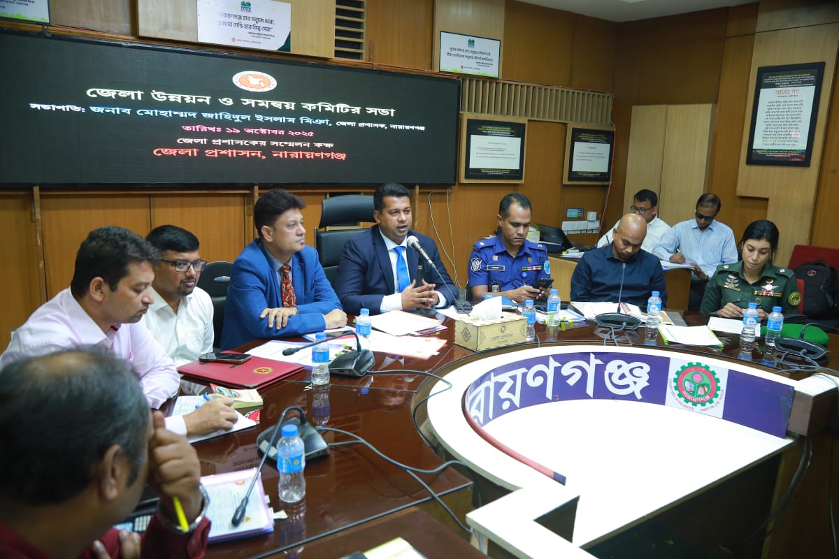 অদ্য ১৯/১০/২০২৫ইং রবিবার সকাল ১০.৩০ঘটিকায় নারায়ণগঞ্জ জেলা প্রশাসক কার্যালয়ের সম্মেলন কক্ষে জেলা প্রশাসক জনাব মোঃ জাহিদুল ইসলাম মিয়ার সভাপতিত্বে জেলা উন্নয়ন সমন্বয় কমিটির সভা অনুষ্ঠিত হয়।অতিরিক্ত জেলা প্রশাসক (সার্বিক)মোঃ আলমগীর হোসেন এর পরিচালনায় উক্ত সভায় উপস্থিত ছিলেন নারায়ণগঞ্জ সিভিল সার্জন ডক্টর এ এফ এম মশিউর রহমান, ডিডি স্থানীয় সরকার বিভাগ মোঃ সোহেল রানা অতিরিক্ত পুলিশ সুপার কানিজ ফারজানা শান্তা, জেলা আনসার কমান্ডার নাইমা ইসলাম, নির্বাহী প্রকৌশলী, জেলা পরিষদ,নির্বাহী প্রকৌশলী গনপুর্ত বিভাগ, কৃষি অফিসার, ডিডি সমাজ সেবা,ডিডি পরিবার পরিকল্পনা, জেলা পরিষদ কর্মকর্তা,ডেপুটি জেলার , উপজেলা নির্বাহী অফিসারগন সহ বিভিন্ন সরকারি দপ্তরের কর্মকর্তা গন উপস্থিত ছিলেন।