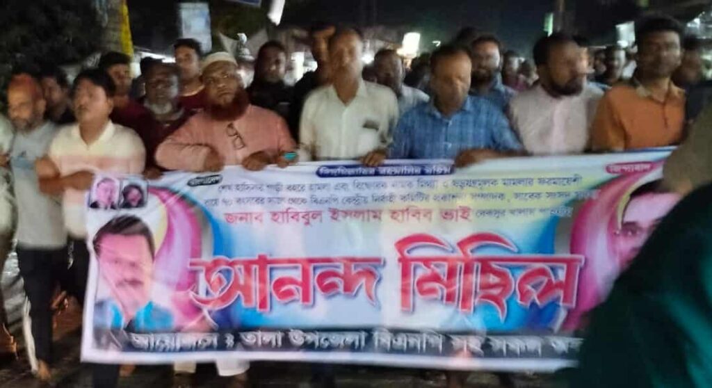 হাইকোর্টের এ রায়ের পর বুধবার (২২ অক্টোবর) সন্ধ্যায় সাতক্ষীরার তালা উপজেলার বিএনপি, যুবদল ও অঙ্গ সংগঠনের নেতাকর্মীরা আনন্দন মিছিল বের করে ৷ মিছিলটি উপজেলার বিভিন্ন গুরত্বপূর্ণ সড়ক প্রদক্ষীন করে এবং স্লোগানে স্লোগানে চারিদিকে মুখরিত করে তোলে ৷ তালা উপজেলা যুবদলের আহবায়ক মির্জা আতিয়ার রহমান ও যুগ্ম আহবায়ক সাইদুর রহমান সাঈদ এর নেতৃত্বে বিএনপির সাবেক তালা উপজেলা সভাপতি মৃণাল কান্তি রায়, সাধারণ সম্পাদক মোঃ শফিকুল ইসলামসহ কয়েকশ নেতা কর্মী আনন্দ মিছিলে অংশগ্রহন করেন