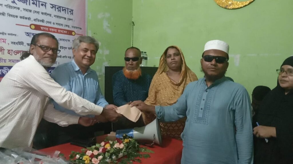 প্রমোদনা অনুদান জাতীয় সমাজ কল্যান পরিষদ ঢাকার অর্থায়নে বাংলাদেশ প্রতিবন্ধী প্রগতি সংস্থার আয়োজনে উক্ত সংস্থার মহাসচিব মোঃইউসুফ আলী হাওলাদারের সভাপতিত্বে অনুষ্ঠানে প্রধান অতিথি হিসেবে উপস্থিত ছিলেন সমাজসেবা কার্যালয় নারায়ণগঞ্জের উপ পরিচালক মোঃ আসাদুজ্জামান সরদার। এসময় সংগঠনের সাংগঠনিক সম্পাদক হাফেজ মাসুদুর রহমানের কোরআন তেলায়াতের মাধ্যমে অনুষ্ঠানের সূচনা হয়।