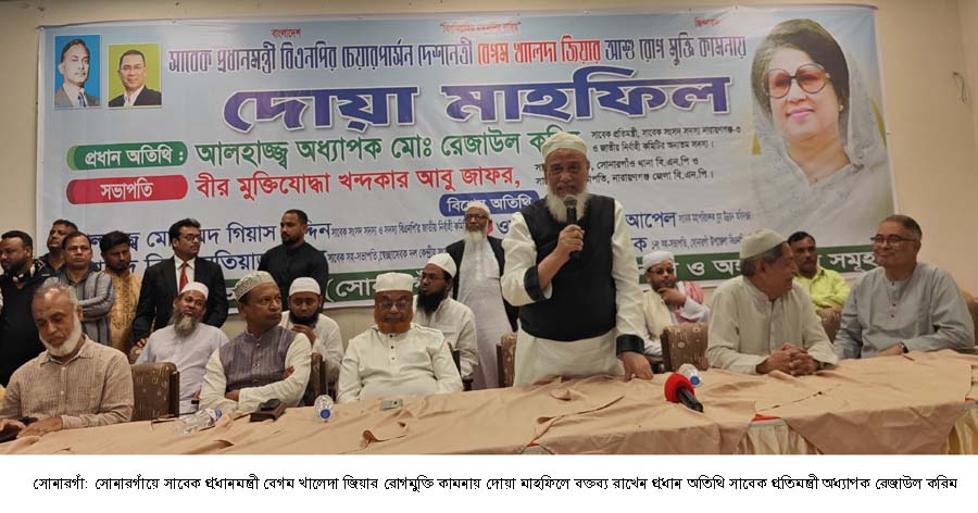 সোনারগাঁ উপজেলা বিএনপির সাবেক সভাপতি বীর মুক্তিযোদ্ধা খন্দকার আবু জাফরের সভাপতিত্বে বিশেষ অতিথি ছিলেন, নারায়ণগঞ্জ-৪ আসনের সাবেক সাংসদ মোহাম্মদ গিয়াসউদ্দিন, কেন্দ্রীয় স্বেচ্ছাসেবক দলের সাবেক সহ সভাপতি অধ্যাপক ওয়াহিদ বিন ইমতিয়াজ বকুল, সোনারগাঁ উপজেলা বিএনপির সহ-সভাপতি আল মুজাহিদ মল্লিক। এসময় বক্তব্য রাখেন, নারায়ণগঞ্জ জেলা স্বেচ্ছাসেবক দলের সদস্য সচিব সালাউদ্দিন সালু,সোনারগাঁ উপজেলা যুবদলের সিনিয়র যুগ্ম আহবায়ক নূর এ ইয়াসিন নোবেল, যুগ্ম আহবায়ক আশরাফ ভূইয়া, সোনারগাঁ পৌর বিএনপির সাবেক সাধারণ সম্পাদক হুমায়ুন কবির রফিক, পৌর যুবদলের সাবেক সভাপতি ফারুক আহমেদ তপন। এসময় সোনারগাঁ উপজেলার বিভিন্ন মসজিদের ইমাম ও মাদ্রাসার শিক্ষক ও বিএনপি ও অঙ্গ সংগঠনের নেতাকর্মীরা উপস্থিত ছিলেন। পরে সাবেক প্রধানমন্ত্রী ও বিএনপি চেয়ারপার্সন বেগম খালেদা জিয়ার রোগ মুক্তি কামনায় দোয়া মাহফিল অনুষ্ঠিত হয়।