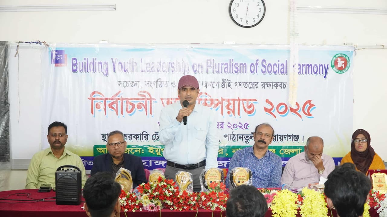 ২৬ নভেম্বর ২০২৫, দি হাঙ্গার প্রজেক্ট বাংলাদেশ এর সহযোগিতায় ইয়ুথ এন্ডিং হাঙ্গার বাংলাদেশ – নারায়ণগঞ্জ জেলা ফোরাম এর আয়োজনে সকাল ৮.৩০ টা থেকে দুপুর ১টা পর্যন্ত নারায়ণগঞ্জ সরকারি টেকনিক্যাল কলেজে Building Youth Leadership on Pluralism & Social Harmony প্রকল্পের অংশ হিসেবে “নির্বাচনী অলিম্পিয়াড ২০২৫” আলোচনা সভা এবং সার্টিফিকেট ও পুরষ্কার বিতরণ অনুষ্ঠিত হয়েছে।