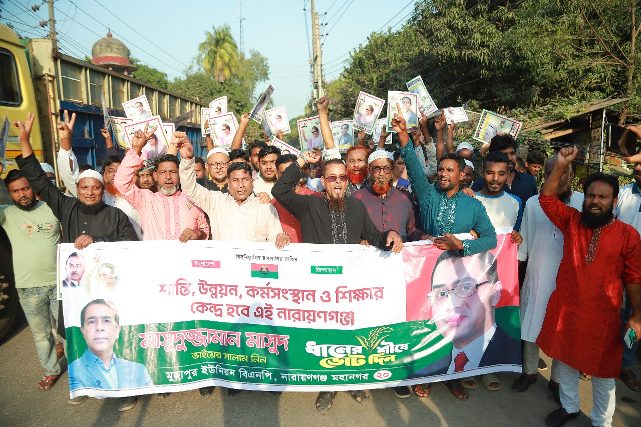 নারায়ণগঞ্জ-৫ আসনে বিএনপির মনোনীত প্রার্থী মাসুদুজ্জামান মাসুদের সমর্থনে অনুষ্ঠিত নির্বাচনী জনসভায় শক্তি প্রদর্শন করে বিশাল মিছিল নিয়ে অংশগ্রহণ করেছে মুছাপুর ইউনিয়ন বিএনপি ও অঙ্গসংগঠনের নেতাকর্মীরা। এই মিছিলের পুরোভাগে ছিলেন বন্দর উপজেলা যুবদলের সাবেক সাংগঠনিক সম্পাদক মোঃ ইব্রাহিম খান।