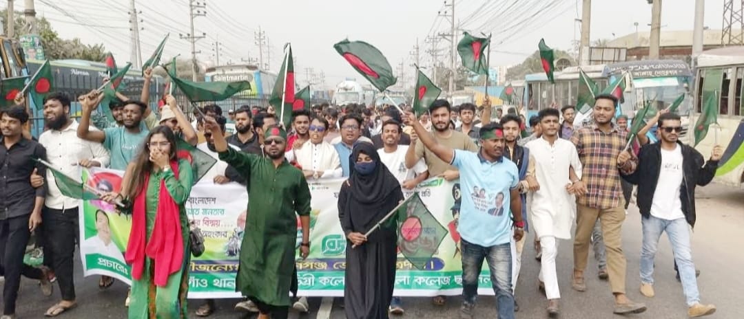 সোনারগাঁ(প্রতিনিধি); মহান স্বাধীনতা দিবস উপলক্ষে সোনারগাঁও উপজেলা সাবেক ছাত্রদলের আহবায়ক ও জেলা ছাত্রদলের সাবেক সিনিয়র যুগ্ম আহবায়ক মো.জাকারিয়া ভুইয়ার নেতৃত্বে বিজয় র্যালি বের করা হয়েছে। ১৬ ডিসেম্বর মঙ্গলবার দুপুরে উপজেলার মোগড়াপাড়া চৌরাস্তার এলাকার মদিনা শপিং কমপ্লেক্স সামনে থেকে র্যালি শুরু করে ঢাকা চট্টগ্রাম মহাসড়কে ছাত্রদলের সক্রিয় নেতা কর্মীদের নিয়ে চৌরাস্তা এলাকা ঘুরে আফিয়া পেট্রোল পাম্প হয়ে খানখায়ে মসজিদের সামনে এসে র্যালি সমাপ্ত হয়। এসময় উপজেলা ছাত্রদলের আহবায়ক ও নারায়ণগঞ্জ জেলা ছাত্র দলের সাবেক সিনিয়ন যুগ্ম আহবায়ক মো.জাকারিয়া ভুইঁয়ার নেতৃত্বে লাল সবুজের পতাকা হাতে হাজারো ছাত্রদলের নেতা কর্মীদের সাথে নিয়ে মহান বিজয় দিবসের চেতনাকে সুমন্নত রাখতে অঙ্গীকার ব্যক্ত করেন এবং গণতন্ত্র পুনরুদ্ধারের লক্ষ্যে স্লোগান দেন। উক্ত বিজয় র্যালিতে অংশ নেন সোনারগাঁও উপজেলা ছাত্রদলের সভাপতি প্রার্থী মোহাম্মদ শাহজালাল,নারায়ণগঞ্জ জেলা ছাত্রদলের সাবেক সহ- সাধারণ সম্পাদক বিল্লাল সরকার. পৌর ছাত্রদলের সাবেক আহবায়ক ফরহাদ সিকদার,উপজেলা ছাত্রদলের উপজেলা ছাত্র দলের যুগ্ম আহবায়ক মাসুদ রানা বাবু,ছাত্রদল নেতা বায়োজিদ ভুইয়া,সোনারগাঁও সরকারি কলেজ শাখা ছাত্রদলের সাধারন সম্পাদক মাহমুদা আক্তার প্রমূখ। জাকারিয়া ভুইয়া বলেন,সকল শহীদদের আত্মত্যাগের বিনিময়ে স্বাধীনতা পেয়েছে স্বাধীন বাংলাদেশে বাস করে রাষ্ট্রভাষা বাংলাকে অক্ষুন্ন রেখে মাতৃভাষার সন্মান রাখতে চান। অবশেষে সকল শহীদের বিনম্র শ্রদ্ধা জানান।