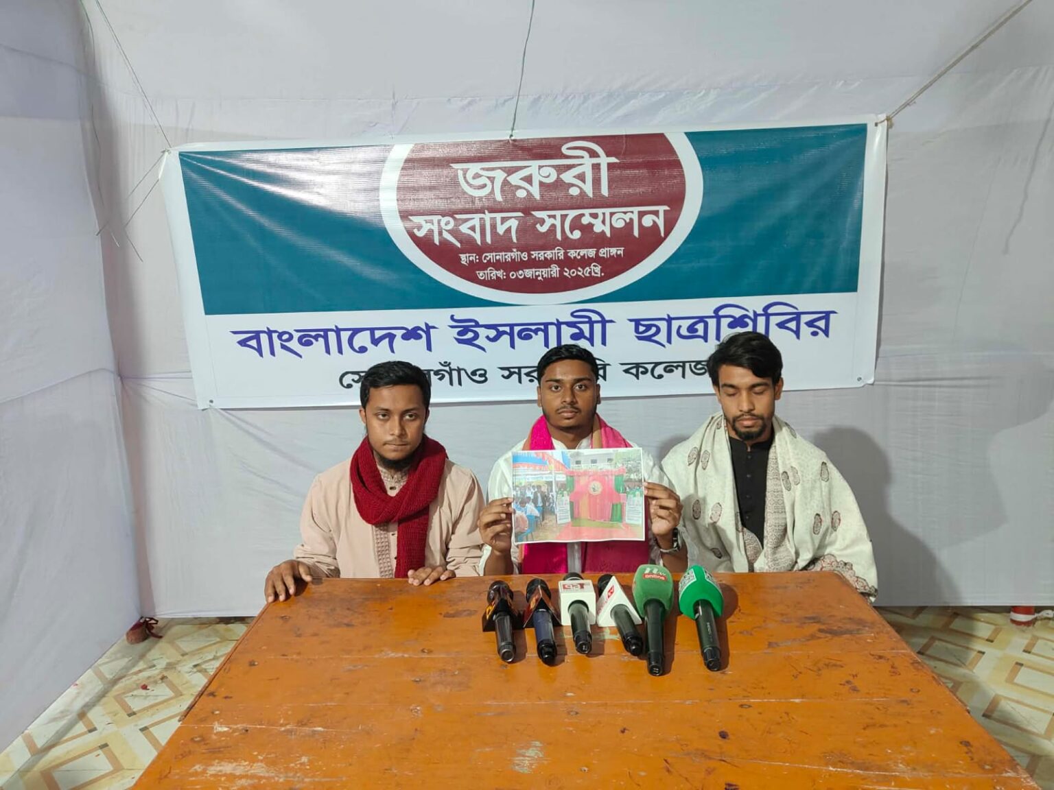 লিখিত বক্তব্যে সোনারগাঁ সরকারী কলেজ ছাত্র শিবিরের সভাপতি হৃদয় জানান,কলেজ ক্যাম্পাসে গতকাল শনিবার সকালে কলেজ কর্তৃপক্ষ একাদশ শ্রেণীর নবীন বরণের আয়োজন করে।ওই নবীন বরণ অনুষ্ঠানে সোনারগাঁ কলেজ ছাত্রদলের পক্ষ থেকে নারায়ণগঞ্জ-৩আসনের বিএনপির মনোনীত সংসদ সদস্য প্রার্থী আজহারুল ইসলাম মান্নানের পক্ষে ফটোকার্ড সাটিয়ে প্রচারণা ও ভোট চাওয়া হয়। বিষয়টি কলেজ কর্তৃপক্ষকে একাধিকবার জানিয়ে কোন সাড়া পায়নি ছাত্র শিবির। এঘটনায় ছাত্রদল ও ছাত্র শিবিরের মধ্যে উত্তেজনা তৈরি হয়। এক পর্যায়ে ছাত্রদল নেতা হাবিবুর রহমান হাবিব ও ভুবনের নেতৃত্বে নেতাকর্মীরা ছাত্রশিবিরের সভাপতি হৃদয় মিয়াসহ ৩ নেতাকর্মীকে একটি কক্ষে অবরুদ্ধ করে মারধর করা হয়। এঘটনার বিষয়ে সোনারগাঁ উপজেলা নির্বাহী অফিসার ও সহকারী রিটার্ণিং কর্মকর্তাকে ফোন করা হলে তিনি রিসিভ করেননি। ঘটনার পর থেকে তারা নিরাপত্তাহীনতার রয়েছেন বলে দাবি করা হয়। সোনারগাঁ সরকারী কলেজের অধ্যক্ষ মো. আবুল কালাম বলেন,ফটোকার্ড বসানোর বিষয়টি জেনে সরিয়ে দেওয়া হয়েছে। ছাত্রদল ও ছাত্রশিবিরের মধ্যে যা ঘটেছে এসিল্যান্ড মিমাংসা করে দিয়েছেন। তবে অবরুদ্ধ করে রাখার বিষয়টি আমার জানা নেই। কেউ অভিযোগও দেয়নি। অভিযুক্ত ছাত্রদল নেতা হাবিবুর রহমান হাবিবের সঙ্গে যোগাযোগ করা হলে তিনি অভিযোগ অস্বীকার করে বলেন, ছাত্র শিবির অভিযোগ দেওয়ার পর সাটানো ফটোকার্ড সরিয়ে নেওয়া হয়েছে। হুমকি ও অবরুদ্ধের বিষয়টি সত্য না। এমন কোন ঘটনা ঘটে থাকলে সিসি ক্যামেরায় থাকবে।