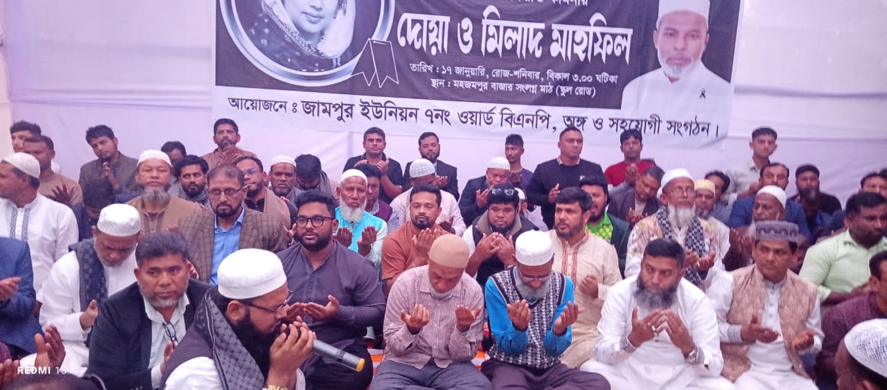 সোনারগাঁ(প্রতিনিধ): আপোষহীন নেত্রী তিনবারের সাবেক প্রধানমন্ত্রী মরহুমা বেগম খালেদা জিয়ার মাগফিরাত কামনা দোয়া মাহফিল অনুষ্ঠিত হয়েছে। ১৭ জানুয়ারি শনিবার বিকেলে উপজেলার জামপুর ইউনিয়নের ৭ নং ওয়ার্ড বিএনপির উদ্যোগে তিনবারের সাবেক প্রধান মরহুমা বেগম খালেদা জিয়ার মাগফিরাত কামনায় মিলাত ও দোয়া মাহফিলের আয়োজন করা হয়। জামপুর ইউনিয়ন ৭নং ওয়ার্ড বিএনপির সভাপতি ও সাবেক ইউপি সদস্য মো.আমজাদ হোসেন লতিফের সভাপতিত্বে প্রধান অতিথি ছিলেন,উপজেলা বিএনপির ১নং সহ-সভাপতি ও জামপুর ইউনিয়ন বিএনপির সভাপতি আলহাজ্ব আল মুজাহিদ মল্লিক। প্রধান মেহমান ছিলেন,নারায়ণগঞ্জ জেলা যুবদলের যুগ্ম সাধারণ সম্পাদক মো.খায়রুল ইসলাম সজিব। বিশেষ অতিথি ছিলেন,সোনারগাঁও থানার সাবেক ছাত্রদল নেতা অধ্যাপক মনিরুল ইসলাম,সোনারগাঁ যুবদলের যুগ্ম সাধারণ মো.আশরাফ ভুইঁয়া,জামপুর ইউনিয়ন বিএনপির সাধারণ সম্পাদক মো.আজহারুল ইসলাম সানোয়ার,বিএনপি নেতা ও উপজেলা পরিষদের সাবেক ভাইস চেয়ারম্যান মো.জাহাঙ্গীর ভুইঁয়া,জামপুর ইউনিয়ন পরিষদের ভারপ্রাপ্ত চেয়ারম্যান মো.কামরুজ্জামান। এসময় জামপুর ইউনিয়ন তথা নারায়ণগঞ্জ জেলা ও বিএনপির ছাত্রদল,যুবদল,সেচ্ছাসেবকদল কৃষকদলসহ বিভিন্ন অঙ্গ ও সহযোগী সংগঠনের নেতৃবৃন্দ উপস্থিত ছিলেন। পরে মরহুমা বেগম খালেদা জিয়ার মাগফিরাত কামনা দোয়া ও তোবারক বিতরণ করা হয়।