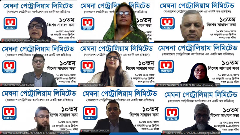 মেঘনা পেট্রোলিয়াম লিমিটেড এর ১০ম বিশেষ সাধারণ সভা এবং ৪৭ তম বার্ষিক সাধারণ সভা শনিবার ( ২৪ জানুয়ারী )যথাক্রমে সকাল ১০ টা ৩০ মিনিটে এবং দুপুর ১২ টায় ‘‘ডিজিটাল প্ল্যাটফর্মে” অনুষ্ঠিত হয়।