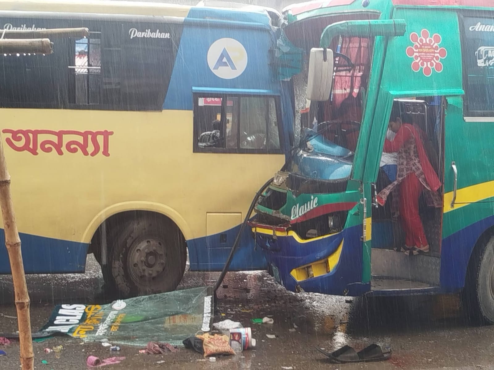স্থানীয় বাসিন্দা সজীব বলেন, “হঠাৎ বৃষ্টির মধ্যে বাস দুটি নিয়ন্ত্রণ হারিয়ে একে অপরকে সজোরে ধাক্কা দেয়। এতে অনেক যাত্রী আহত হন।”