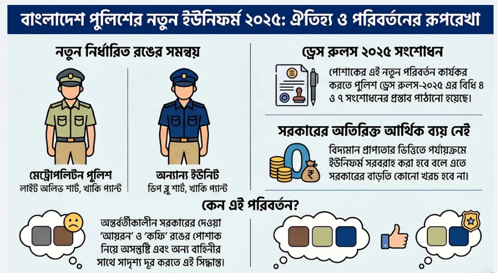 সংশ্লিষ্ট কর্তৃপক্ষের মতামতক্রমে পুলিশের ইউনিফর্ম সকল মেট্রোপলিটন পুলিশের ক্ষেত্রে শার্টের রঙ Light Olive TC (Plain Fabric) ও এপিবিএন, এসপিবিএন, এসবি, সিআইডি, র্যাব ব্যতীত অন্যান্য সকল পুলিশের ক্ষেত্রে শার্টের রঙ Deep Blue TC (Plain Fabric) এবং উভয় ক্ষেত্রে প্যান্টের রঙ TC Twill Khaki নির্ধারণ করেন। উক্ত প্রস্তাবনাটি কার্যকর করার জন্য Police Dress Rules, 2025 এর নিম্নোক্ত বিধি সংশোধনের নিমিত্তে অনুমোদন প্রয়োজন।