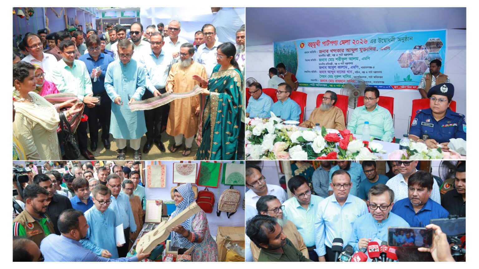 মেলা উদ্বোধন অনুষ্ঠানটি নারায়ণগঞ্জ জেলা প্রশাসক মোহাম্মদ রায়হান কবিরের সভাপতিত্বে প্রধান অতিথি হিসেবে উপস্থিত ছিলেন বস্ত্র ও পাট মন্ত্রণালয়ের মাননীয় মন্ত্রী খন্দকার আব্দুল মুক্তাদির, এমপি। বিশেষ অতিথি হিসেবে উপস্থিত ছিলেন বস্ত্র ও পাট মন্ত্রণালয়ের মাননীয় প্রতিমন্ত্রী মোঃ শরীফুল আলম, এমপি এবং নারায়ণগঞ্জ-৫ আসনের মাননীয় সংসদ সদস্য আবুল কালাম, এমপি।বস্ত্র ও পাট মন্ত্রণালয়ের সচিব আব্দুন নাসের খান, পাট অধিদপ্তরের মহাপরিচালক সৈয়দ মো. নুরুল বাসির।