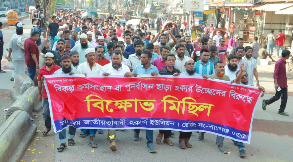 উচ্ছেদ অভিযান অব্যাহত আন্দোলনের চতুর্থ দিনে আবারও নারায়ণগঞ্জ শহরের হকাররা পুনর্বাসনের আগে উচ্ছেদের বিরোধীতা করে বিক্ষোভ মিছিল করেছে। তাদের দাবি, পুনর্বাসনের আগ পর্যন্ত বিকেল চারটা থেকে তাদের ফুটপাতে বসতে দেওয়া হোক।